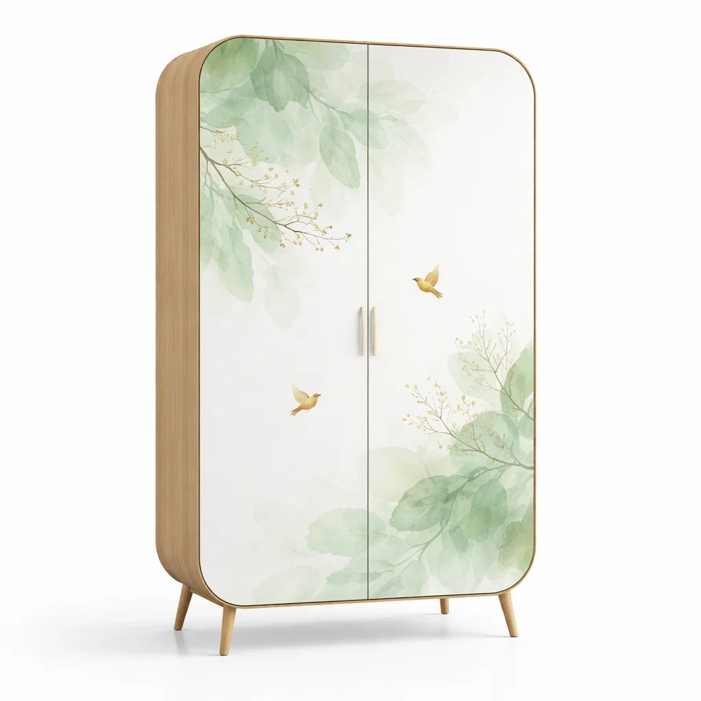 Elle est dotée de deux portes et contient deux étagères, sans tiroirs. Le poids net de l'armoire est de 45 kg. La couleur de base est Blanche avec un motif Vert et Jaune représentant des feuilles et des oiseaux.